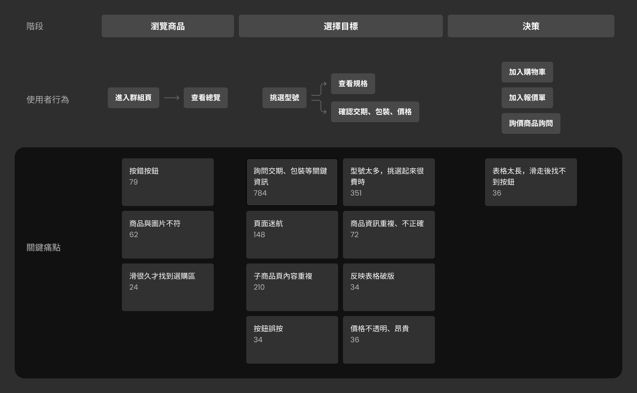 我們將工單分類並將主要痛點做成使用者旅程地圖,並結合錄影分析使用者在頁面上的的真實操作行為來歸納關鍵痛點。