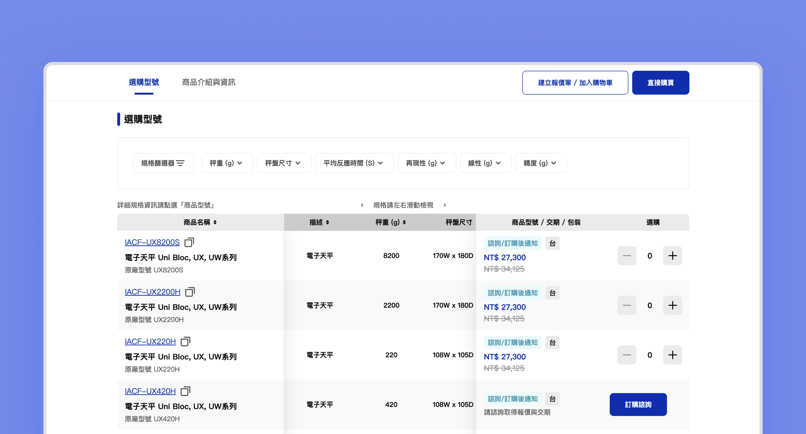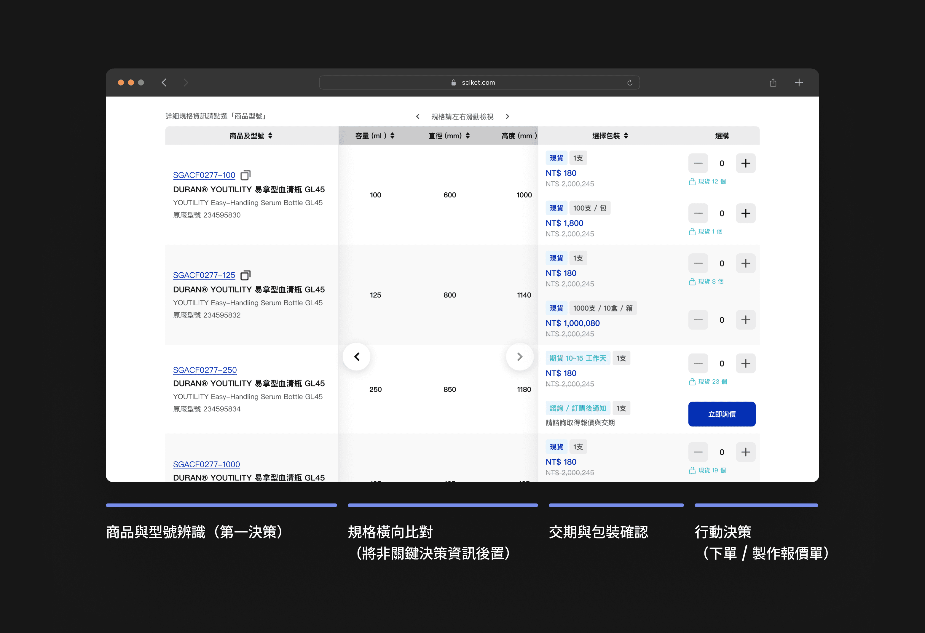 我們依據使用者決策流程重新編排欄位順序與位置:左側呈現商品與型號、中段為可滑動規格、右側集中價格與交期資訊,幫助使用者在第一眼快速比對與判斷。